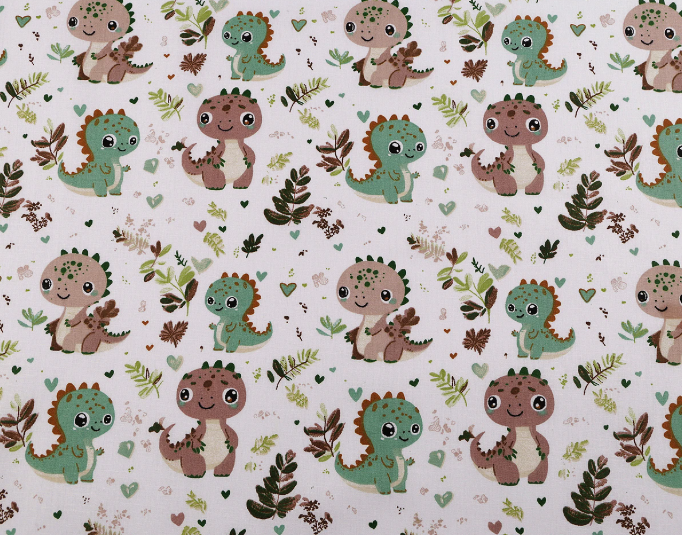 Ce tissu en coton à pour motif des dinosaures sur fond de coloris blanc